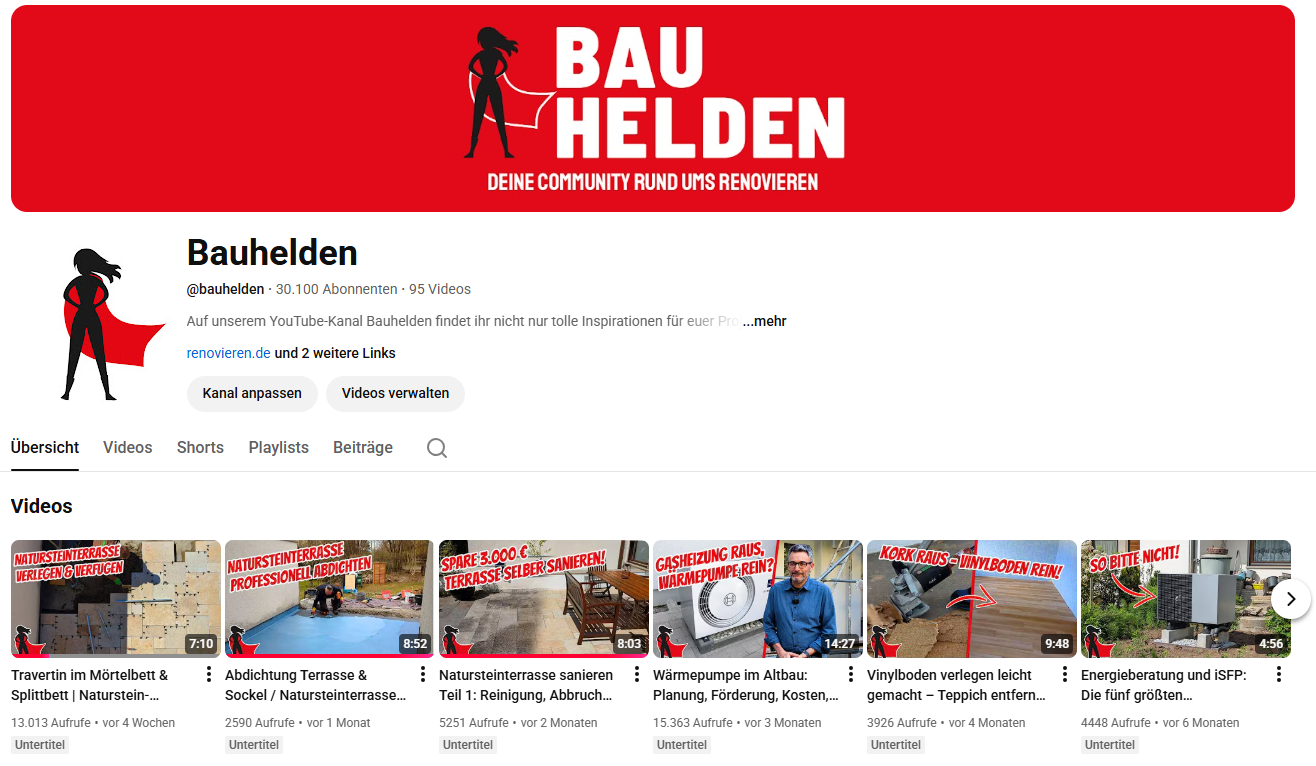 Ein Highlight sind die spannenden Doku-Serien, in welchen wir junge Familien auf ihrem Weg mit viel Eigenleistung vom komplett sanierungsbedürftigen Haus hin zum Traum-Eigenheim begleiten. Zudem bieten wir übergreifende Ratgebervideos zu komplexeren Themen, ebenso wie Schritt-für-Schritt-Anleitungen. Egal, ob es darum geht, ein altes Haus zu sanieren, eine Wohnung zu renovieren oder nur mal schnell einen Raum neu zu streichen: Bauhelden ist der Kanal für alle, die wissen wollen, wie’s geht. Das beweisen auch zwischenzeitlich eine Vielzahl von dauerhaften Abonnenten, mehr als 30.000 Youtube-Nutzer haben den Kanal Bauhelden bereits abonniert.
